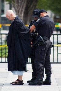 This action was about the Alberta tar sands, specifically about the plan to put a pipeline from the tar sands to Canada, through the middle of North America, through wilderness, farms, ranches, mountains, and the Ogalalla aquifer. Every day groups of us stood or sat in front of the White House and got arrested for disobeying police orders. It was all very polite and civilized, though uncomfortable. Most of us paid our bond and left in a few hours, never seeing the inside of a jail. In 14 days, 1252 people were arrested.  Most people came and left in 3 days; some stayed to support or volunteer. On the “religious leaders” day I spoke for Buddhism and got arrested in full robes. On the other days I sat zazen an hour or so on, facing the White House.